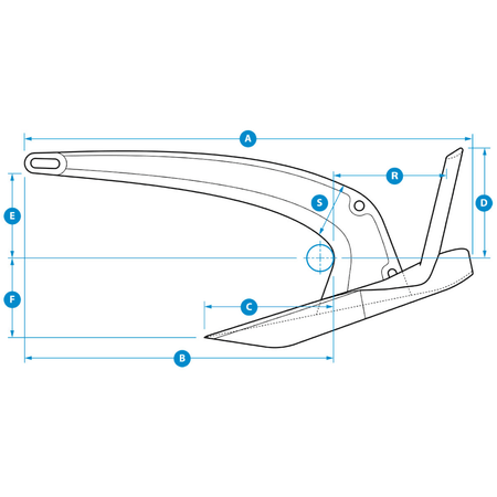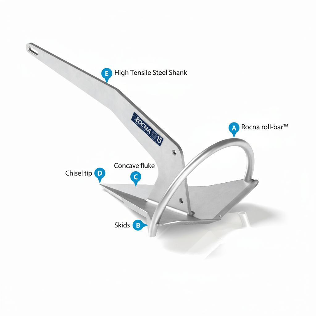 - Roll-Bar (Arco di Rotolamento) Brevettato: Il Rocna Roll-Bar™ assicura che l'ancora arrivi sempre all'angolazione ideale per la penetrazione nel fondale. Non importa come tocchi il fondo, l'ancora sarà sempre orientata correttamente.
