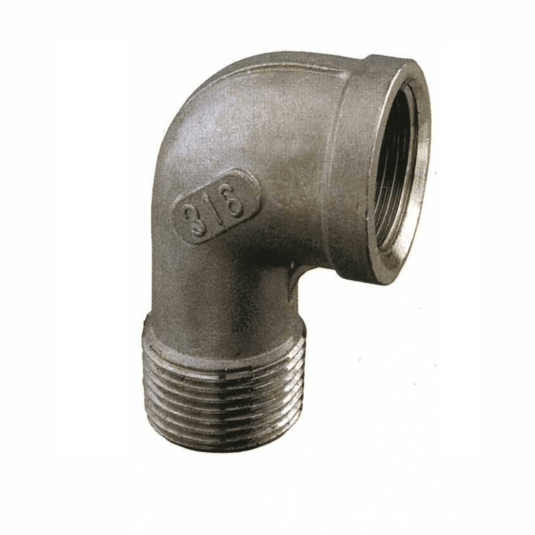 Raccordo a gomito a 90° in Acciaio Inox, con un lato maschio e uno femmina. Essenziale per le deviazioni di linea e resistente alla corrosione di bordo.